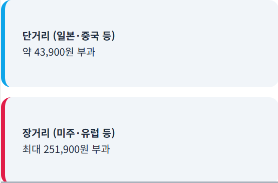 - 국제선 (거리 비례제): 항공사마다 차이가 있지만, 대개 운항 거리를 7~10개 구간으로 나누어 부과합니다. 2026년 4월 아시아나항공 기준으로 일본·중국 등 단거리 노선은 약 43,900원, 미주·유럽 등 장거리 노선은 최대 251,900원까지 부과됩니다.