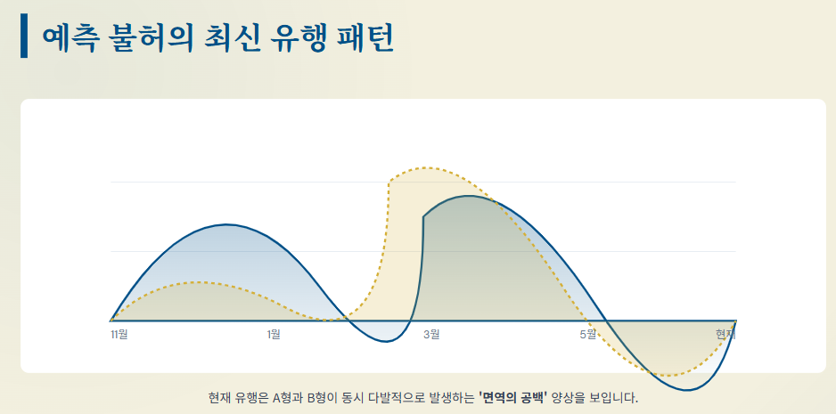 - 현재의 양상: 최근에는 A형 두 가지와 B형 한 가지가 동시다발적으로 유행하고 있습니다. 이는 지난 3년간의 코로나 팬데믹 기간 동안 마스크 착용과 거리두기로 인해 인류의 독감에 대한 '집단 면역 원성'이 급격히 떨어졌기 때문으로 분석됩니다. 3~4년 주기의 대유행 규칙마저 무너진 지금, 우리는 어느 때보다 독감에 취약한 상태에 놓여 있습니다.