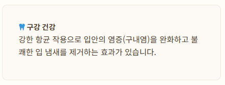 - 구강 건강 증진: 강한 항균 작용으로 입안의 염증(구내염)을 완화하고 입 냄새를 제거합니다.