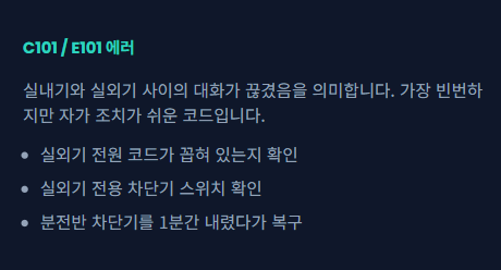 | C101 / E101 | 실내외기 통신 불능 | 시스템 | 분전반(두꺼비집) 내 에어컨 전용 차단기를 내렸다가 1분 뒤 다시 올림 |