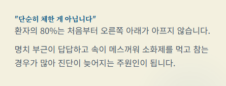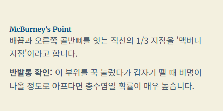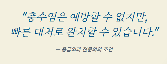 - 통증의 순서: 명치/배꼽 주변 통증 → 메스꺼움/식욕 저하 → 오른쪽 아랫배 통증 고정.