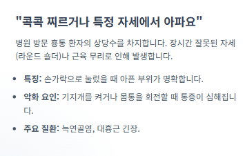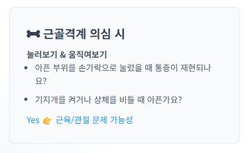 • 근골격계 의심 시: 아픈 부위를 손가락으로 눌러봅니다. 누른 부위에서 통증이 느껴지거나 자세 변화(기지개, 몸통 회전) 시 통증이 달라지면 근육/뼈 문제일 가능성이 높습니다.