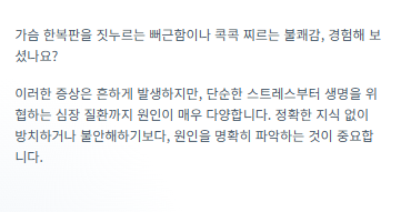 • 양상: 가슴 중앙이 쥐어짜는 듯, 압박하거나 짓누르는 듯한 뻐근함.