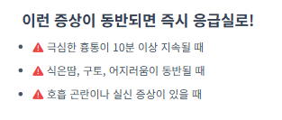 • ⚠️ 경고: 통증이 10분 이상 지속되거나, 식은땀, 구토, 실신 등이 동반되면 즉시 119에 연락하거나 응급실을 찾아야 합니다.