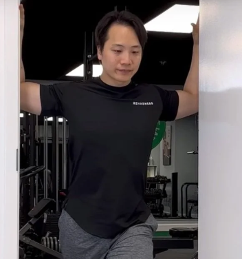 2. 문틀 스트레칭: 문틀에 팔을 기대고 한 발을 앞으로 내딛으면서 가슴 앞쪽이 늘어나는 것을 느낍니다.