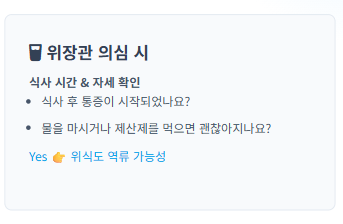 • 위장관 의심 시: 식사 시간과 통증 발생 시간을 연결해 봅니다. 제산제나 물을 마신 후 증상이 호전되는지 확인합니다.