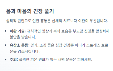 - 다른 증상 없이 답답함과 불안이 동반되면 심리적 원인 (이완 및 스트레스 관리).