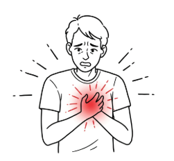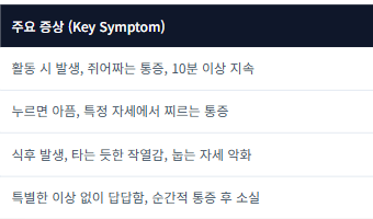 - ⚠️ 경고: 통증이 10분 이상 지속되거나, 식은땀, 구토, 실신 등이 동반되면 즉시 119에 연락하거나 응급실을 찾아야 합니다.
