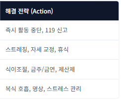 - 💡 조치: 이 중 하나라도 해당된다면 즉시 활동을 중단하고 휴식을 취하며, 증상이 지속되면 곧바로 응급의료기관(119)에 도움을 요청해야 합니다.