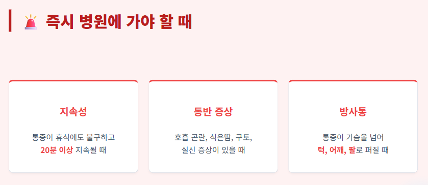 2. 위험 신호 확인: 통증이 10분 이상 지속되거나 쥐어짜는 듯하며 왼쪽 팔, 턱 등으로 통증이 퍼지거나 식은땀, 실신 등이 동반되면 즉시 119에 연락하거나 응급실을 찾아야 합니다.
