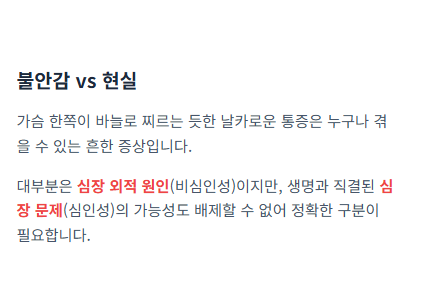 • 가슴 통증의 약 80% 이상을 차지하며, 주로 날카롭고 짧은 통증이 특징입니다. 통증의 위치가 손가락으로 정확히 지목 가능하거나 자세를 바꿀 때 통증이 달라지는 경우가 많습니다.