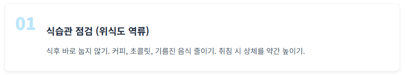 2. 취침 습관: 식사 후 바로 눕지 않고, 취침 시 상체를 약간 높여 위산 역류를 방지합니다.