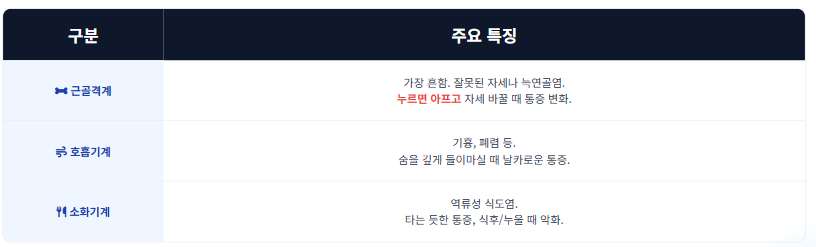 • 소화기계: 위식도 역류 질환(GERD)은 가슴 중앙에 타는 듯한 통증(Heartburn)을 유발하지만, 때로는 콕콕 찌르는 것처럼 느껴지기도 합니다. 식사 후나 누울 때 증상이 악화됩니다.