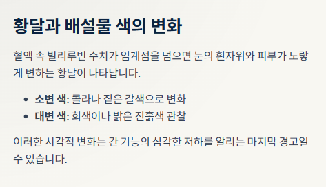 - 주요 증상: 만성 피로, 메스꺼움, 황달, 진한 소변, 피부 가려움증