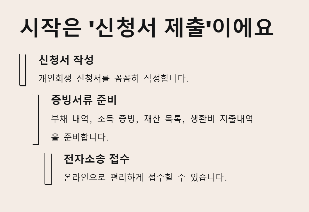 이때 그냥 신청서만 내는 게 아니라, 부채 내역, 소득 증빙, 재산 목록, 생활비 지출내역 같은 서류들도 같이 제출해야 해요.