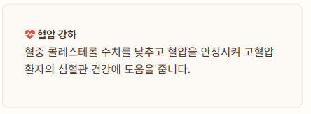 - 혈압 강하 및 심혈관 건강: 혈중 콜레스테롤 수치를 낮추고 혈압을 안정시켜 고혈압 환자에게 도움이 됩니다.