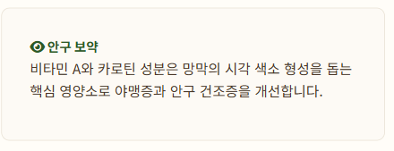 - 시력 보호 및 안구 질환 예방: 눈의 충혈을 완화하고 야맹증 및 안구 건조증 개선에 효과적입니다.