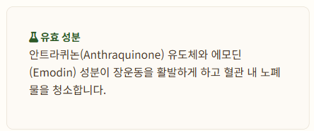 - 변비 해소: 안트라퀴논 성분이 장 점막을 자극하여 장의 연동 운동을 촉진, 변비를 완화합니다.