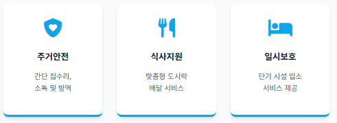 - 5대 기본 서비스: 생활돌봄(가사 지원), 동행돌봄(병원 등 외출), 주거안전(집수리/방역), 식사지원(도시락 배달), 일시보호(단기 시설 입소)