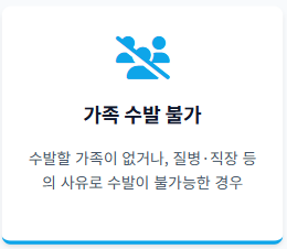 - 수발할 수 있는 가족이 없거나, 있더라도 질병·직장 등의 사유로 수발할 수 없는 경우