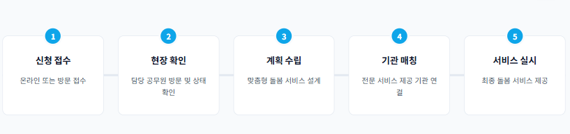 - 진행 절차: 신청 접수 → 담당 공무원 현장 방문 및 확인 → 돌봄 계획 수립 → 서비스 제공기관 매칭 → 서비스 실시