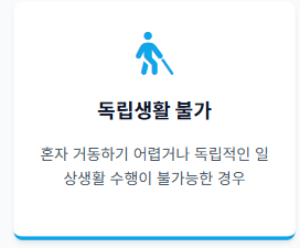 - 혼자 거동하기 어렵거나 독립적인 일상생활 수행이 불가능한 경우