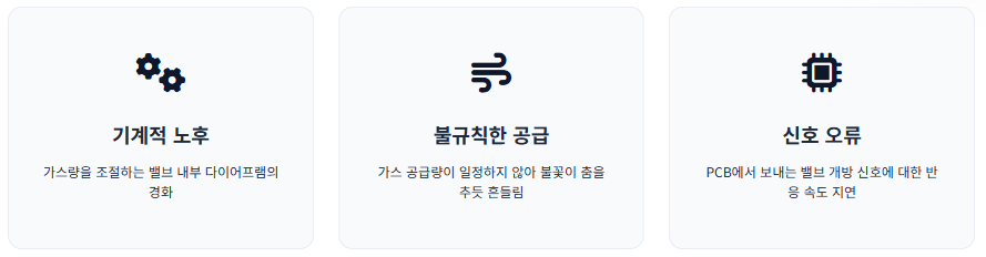 가스량을 정밀하게 조절해야 하는 밸브 내부의 다이어프램이 경화되거나 이물질이 끼면 가스가 불규칙하게 공급되어 화염이 춤을 추듯 불안정해집니다.
