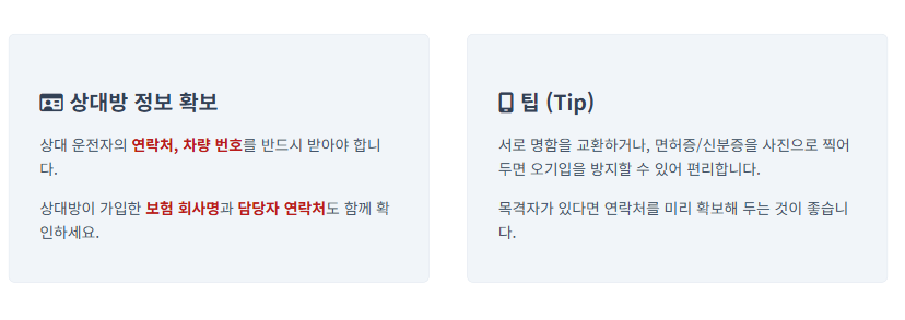 | 현장 | 안전 확보, 부상자 확인(119), 증거 촬영, 상대방 정보 교환 |