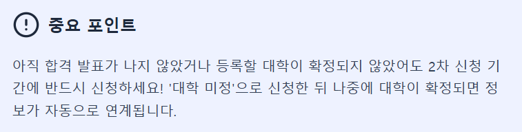 2차 신청 대상은 주로 신입생(입학 예정자), 편입생, 재입학생, 복학생입니다. 특히 신입생의 경우 합격한 대학이 확정되지 않았더라도 '소속 대학 미정'으로 신청이 가능하므로, 기간 내에 일단 신청해 두는 것이 유리합니다. 2차 신청자는 등록금 고지서에서 우선 감면을 받지 못하고 추후에 환급받는 형식으로 지급될 가능성이 높다는 점을 참고하시기 바랍니다.