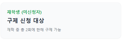재학생은 원칙적으로 1차 기간에 신청해야 하며, 이 시기를 놓친 재학생은 재학 중 단 2회에 한해 구제 신청이 자동으로 적용되어 2차 기간에 심사를 받을 수 있습니다. 만약 이미 2회의 구제 기회를 모두 사용했다면 2차 신청을 하더라도 탈락 사유가 될 수 있으니 주의가 필요합니다.