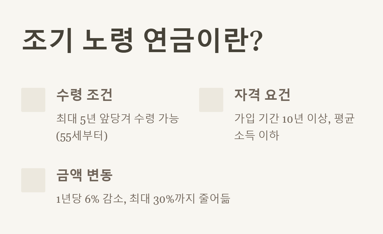 - 국민연금을 최대 5년 앞당겨 수령 가능 (최소 55세부터)