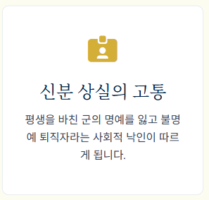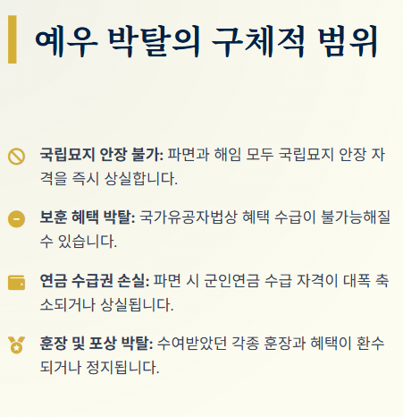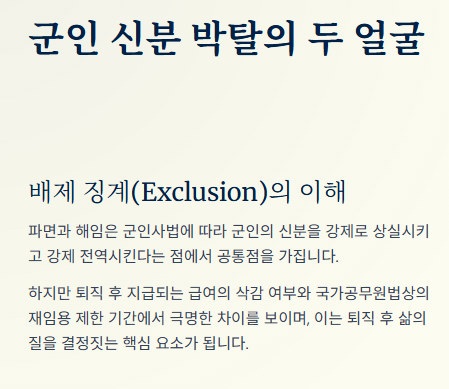 | 신분 박탈 | 즉시 상실 (강제 전역) | 즉시 상실 (강제 전역) |