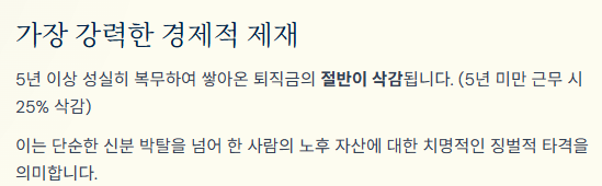 | 퇴직급여 삭감 | 50% 삭감 (5년 이상 근무 시) 25% 삭감 (5년 미만 근무 시) |