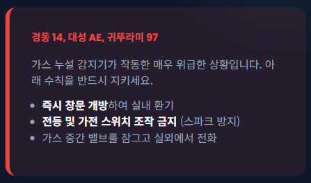 경동 14번, 대성 AE, 귀뚜라미 97번 에러는 가스 감지기가 작동했다는 매우 위급한 신호입니다. 이때는 절대로 보일러를 켜거나 전등 스위치를 조작해서는 안 됩니다. 아주 미세한 스파크로도 폭발 사고가 날 수 있기 때문입니다. 즉시 모든 창문을 열어 환기하고, 가스 중간 밸브를 잠근 뒤 공급업체나 전문가를 호출하는 것이 유일하고도 가장 안전한 대처법입니다.