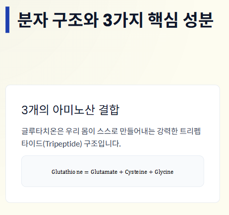 글루타치온(Glutathione)은 우리 몸의 모든 세포에서 생성되는 강력한 항산화제로, 세 개의 아미노산(글루탐산, 시스테인, 글리신)이 결합된 구조입니다. 흔히 '항산화제의 왕' 또는 '백옥 주사 성분'으로 알려져 있으며, 체내 독소를 제거하고 면역 체계를 강화하는 데 필수적인 역할을 합니다.