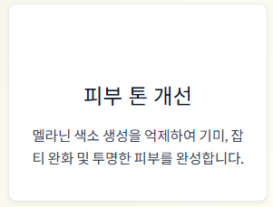 - 피부 미백 및 개선: 멜라닌 색소 생성을 억제하여 기미, 잡티를 완화하고 피부 톤을 밝게 만듭니다. 피부 탄력을 개선하고 염증성 피부 질환(여드름 등) 완화에도 효과적입니다.