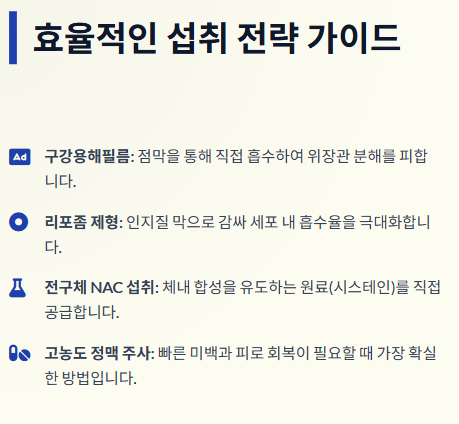 - 전구체 섭취: 글루타치온의 원료가 되는 **NAC(N-아세틸시스테인)**나 단백질 식품을 섭취하여 체내 합성을 유도할 수 있습니다.