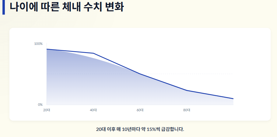- 노화: 20대 이후부터 10년마다 약 10~15%씩 감소하며, 60대 이후에는 20대의 절반 수준으로 떨어집니다.
