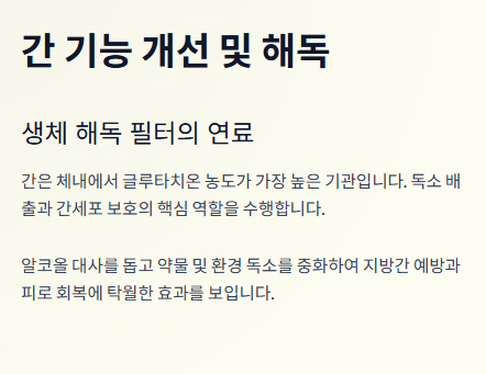 - 간 기능 개선 및 해독: 간에서 독성 물질을 중화하고 배출하는 데 핵심적인 역할을 합니다. 알코올 분해를 돕고 간세포 손상을 방지하여 지방간 개선에 도움을 줄 수 있습니다.