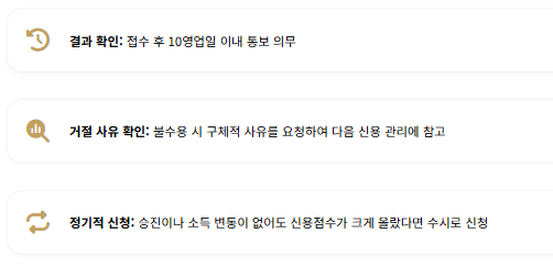 - 결과 통보 기간: 금융회사는 신청 접수일로부터 10영업일 이내에 수용 여부 및 사유를 전화, 문자, 이메일 등으로 안내해야 합니다.