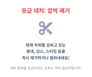 급성구획증후군이 의심될 때 가장 먼저 해야 할 일은 해당 부위를 압박하고 있는 모든 요소를 제거하는 것입니다. 만약 기브스나 붕대를 감고 있다면 즉시 가위로 잘라 압력을 낮춰야 합니다. 이때 주의할 점은 환부를 심장보다 높게 올리지 않는 것입니다. 보통 부기를 빼기 위해 다리를 올리곤 하지만, 구획증후군 상황에서는 환부를 높이면 동맥 압력이 떨어져 혈류 공급이 더 악화될 수 있기 때문입니다.