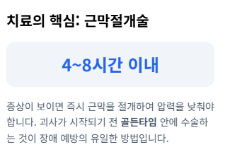급성구획증후군은 예고 없이 찾아오는 응급 질환이지만, 초기 증상을 예민하게 살피면 충분히 대처할 수 있습니다. 사고 이후 손상 부위의 통증이 일반적인 수준을 벗어나 비정상적으로 심해지거나 감각이 둔해진다면, 절대 지체하지 말고 응급실로 향해야 합니다.