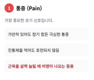 - 통증(Pain): 가장 초기에 나타나는 증상으로, 손상 부위를 움직이지 않아도 극심한 통증이 느껴집니다. 특히 진통제를 복용해도 통증이 완화되지 않으며, 근육을 수동적으로 늘릴 때 비명이 나올 정도의 통증이 동반됩니다.