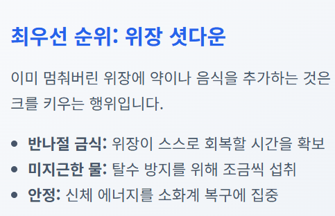 1. 금식과 휴식: 위장이 멈춘 상태에서 약이나 음식을 추가하는 것은 리스크를 키우는 일입니다. 최소 반나절은 금식하며 위장이 쉴 수 있는 시간을 주어야 합니다.