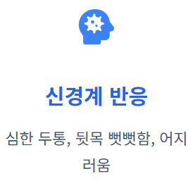 • 전신 반응: 뒷목이 뻣뻣해지는 느낌, 전신 근육통, 오한(으슬으슬 추움), 식은땀, 심한 두통이 동반됩니다.