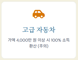 • 예외: 차령이 10년 이상 된 차량은 고급 자동차에서 제외되어 일반 재산으로 분류됩니다.