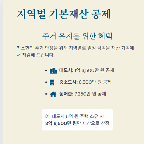 • 금융 재산: 예금, 적금, 보험 등에서 가구당 2,000만 원을 기본으로 공제해 줍니다.