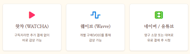 - OTT 스트리밍 서비스: * 왓챠(WATCHA): 현재 월정액 구독 서비스 항목에 포함되어 있어 구독자라면 별도 결제 없이 바로 시청이 가능합니다.