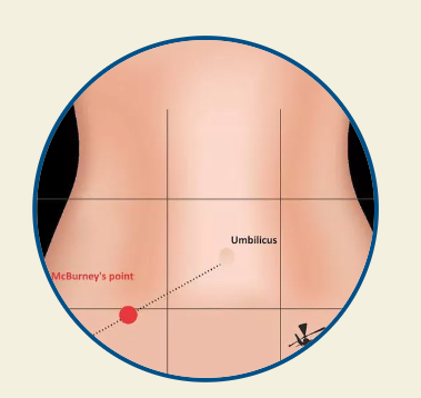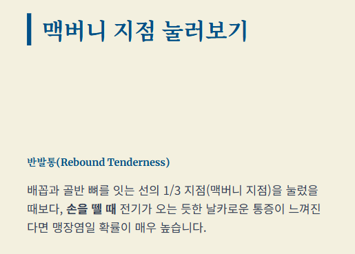- 후기 증상: 오른쪽 하복부의 극심한 통증 말기에 접어들면 오른쪽 아랫배를 살짝만 건드려도 소리를 지를 정도의 통증이 나타납니다. 특히 맥버니 지점이라고 불리는 곳을 눌렀을 때보다 뗐을 때 통증이 더 심한 반발통이 나타난다면 매우 위험한 신호입니다. 이때는 기침을 하거나 걸을 때마다 배가 울리는 현상이 발생합니다.