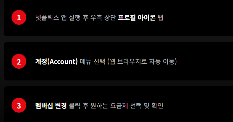 - 모바일 환경: 넷플릭스 앱을 실행한 후 오른쪽 상단의 프로필 아이콘을 누릅니다. 계정 메뉴를 선택하면 웹 브라우저로 자동 연결됩니다. 여기서 멤버십 변경 버튼을 클릭하여 원하는 요금제를 선택하고 확인을 누르면 완료됩니다.